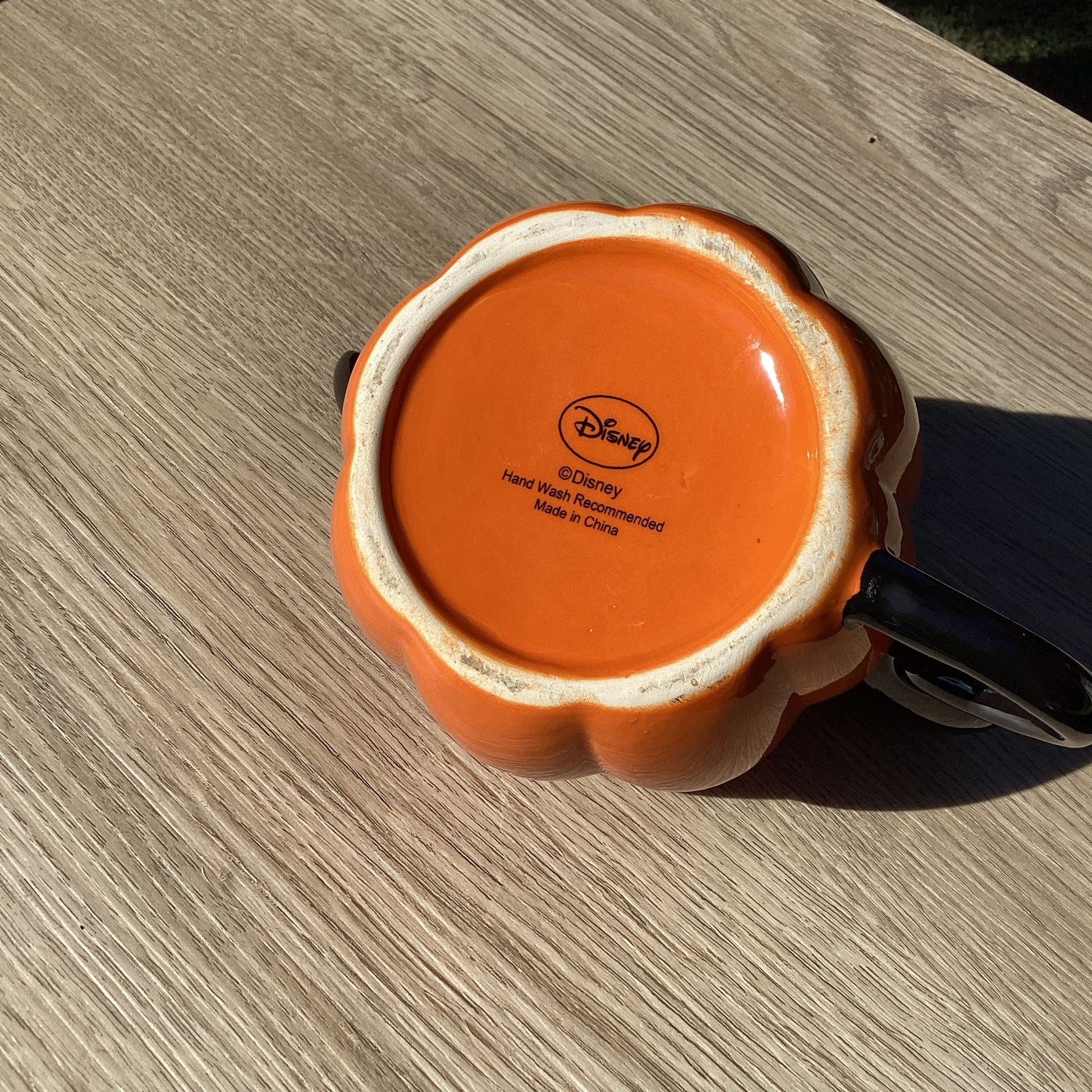 Vessel: Repurposed Disney ceramic mug shaped like Mickey Mouse’s smiling pumpkin face with glossy black ears and handle